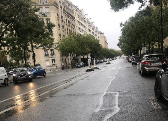 Paris sans voitures, Paris sans vélo en raison de la pluie. Voitures électriques à l’arrrêt, VTC et taxis presque à…