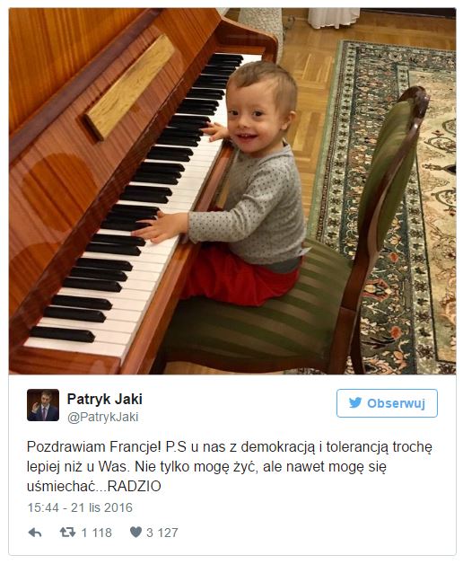 Patryk Jaki, vice-ministre de la Justice dans le gouvernement polonais, est le papa d’un petit garçon trisomique. Il a lui-même réagi dans le cadre de la campagne sur Twitter sous le hashtag #uśmiechnijsięFrancjo et #sourireFrance, qui voit des internautes publier des photos d’enfants touchés par le syndrome de Down (trisomie 21) au visage souriant. Le vice-ministre a publié un tweet avec la photo de son fils souriant et le commentaire : “Bonjour la France ! P.S. : chez nous la démocratie et la tolérance vont un peu mieux que chez vous. Non seulement je peux vivre, mais je peux aussi sourire… RADZIO”