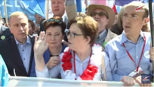Outre le PO, étaient également présents les partis Nowoczesna.pl (autre parti libéral créé avant les élections de 2015 pour récupérer les déçus du PO), le parti « paysan » PSL (partenaire minoritaire de la coalition gouvernementale PO-PSL, au pouvoir de 2007 à 2015), et le SLD social-démocrate (et post-communiste). Tous les principaux leaders de l’opposition étaient là, y compris Mateusz Kijowski, le leader du KOD à l’origine de la création de cette organisation en novembre 2015 par un appel sur Facebook. Mateusz Kijowski, père de quatre enfants, dont trois issus d’un premier mariage et pour lequel ce grand défenseur de l’État de droit en Pologne ne payait pas la pension alimentaire qu’il devait avant que les médias ne commencent à en parler en décembre dernier.