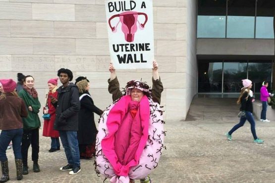 “Vivre Donald Trump, Notre Seigneur!”, armé d’un panneau “Grab women by pussy” et hurlant America great again, un jeune homme, facétieux et courageux, s’est amusé à jouer au pro-Trump pour perturber une manifestation féministe place